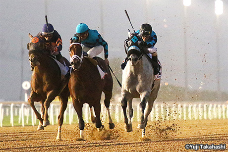 すんなりと8頭がゲートに納まって、スタートを切ると、ロケットスタートを決めたのは、前哨戦のマハブアルシマール(G3)をレコードタイムで逃げ切ったジョーダンスポート(せん5歳)。ファウジ・ナス調教師は、例え8頭立てだとはいえ、大外枠になったことを嘆いていたが、快速を生かして内へと切れ込んでいく。同じ脚質のエックスワイジェットは完全に前に入られ、キックバック(砂の跳ね返り)をよけるために1頭分外へと持ち出した。その後ろを内にマテラスカイ(牡4歳、栗東・森秀行厩舎)、外にマイキャッチ(せん7歳)が、この直後をロイエイチが「いつでもかわせるぞ」という気配で続いた。マインドユアビスケッツは、スタートこそ五分だったが、二の脚がつかず、レイナルドザウィザード(せん12歳)が内に切れ込んだのと入れ替わりで外に持ち出して、最後方を追走した。