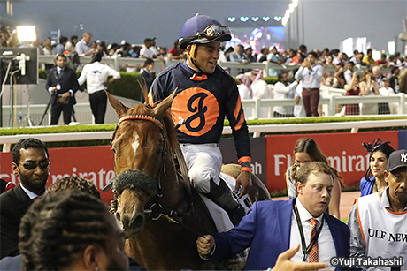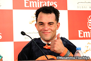 「この馬はゴールがどこかを知っている馬だし、絶対に諦めない馬だと信じていたけど……。さすがに4コーナーを回ったときの9〜10馬身のビハインドは諦めそうになりました。2頭のアメリカの馬はとてもリスペクトしていますので、簡単ではないと思いました。スタートして外のエックスワイジェットがすぐ前に行ってくれたおかげでうまく外に切り替えられ、受けるキックバックも少なく済んだと思います」