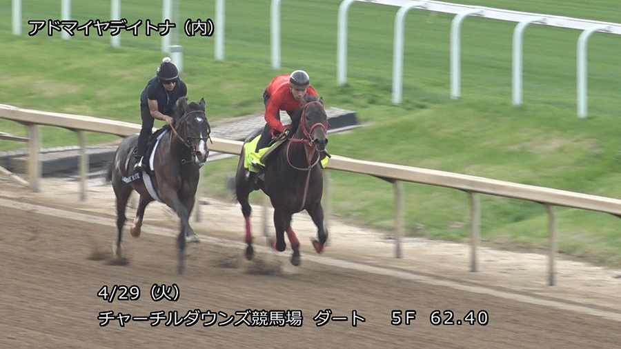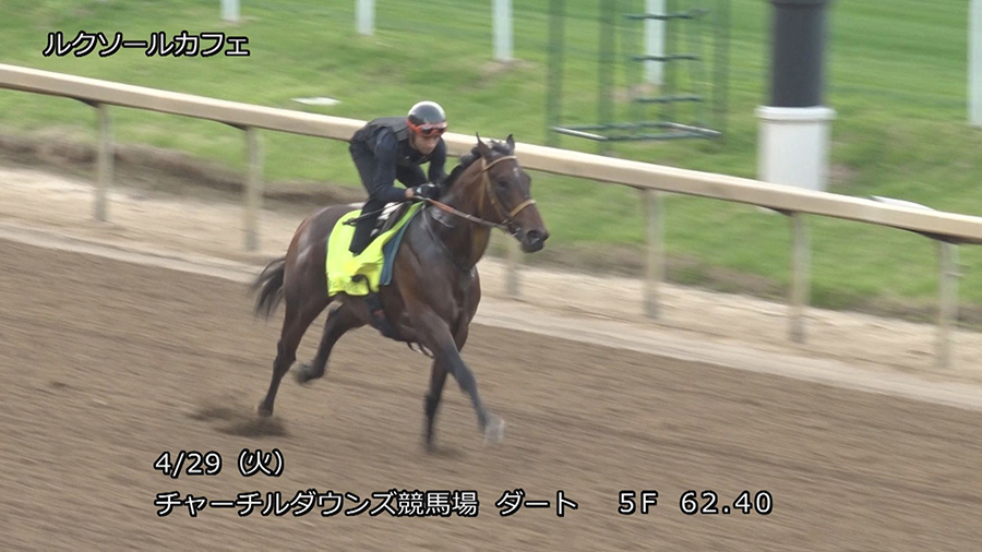 今朝の調教は、キャンターで馬場を1周してウォーミングアップを行った後、1,000mの追い切りを行いました。ハードな内容ではなく、微調整として馬の感触を確かめる程度でしたが、フットワークはスムーズでリズムも良く、精神面も良い雰囲気でした。調教後の様子も良く、順調だと思います。ケンタッキーダービーという舞台に臨めることを楽しみにしています。