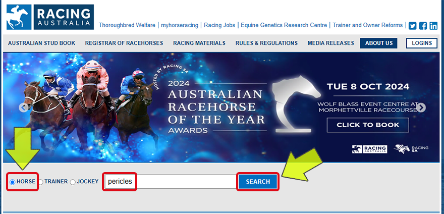 「HORSE」のラジオボタンを選択した状態で、中央の検索窓に「pericles」と打ち込みます。「SEARCH」をクリックすると、「PERICLES」という文字列を馬名に含む過去の馬が表示されます。