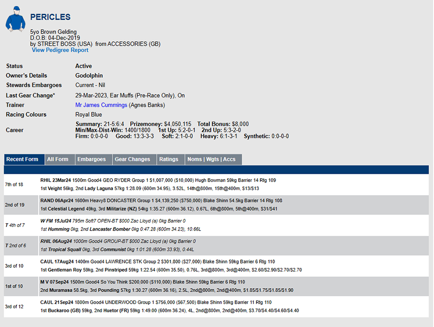 「PERICLES」〔2019年生まれ、オーストラリア・J.カミングス(J. Cummings)厩舎〕のプロフィールを調べます。