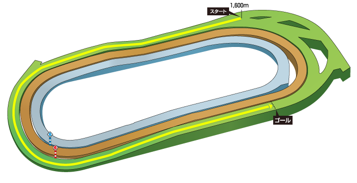 2コーナーにあるスタート地点から、3コーナーに真っすぐ向かっていくレイアウト。向正面半ばに上りがあり、その後3コーナーにかけて下っていく。最後の直線は525.9メートル。直線に向いてすぐに約160メートルの上り(高低差2.0メートル)があり、ゴールまでの残り300メートルはほぼ平坦。前半が速くなりやすく、坂を上った後にゴール前でもう一段末脚を伸ばすことが要求される。速い時計の決着になると、スプリンタータイプ、インを回ってくる馬が好走しやすく、逆に時計がかかるときには、末脚のしっかりしたタイプ、中距離型が好走しやすい。