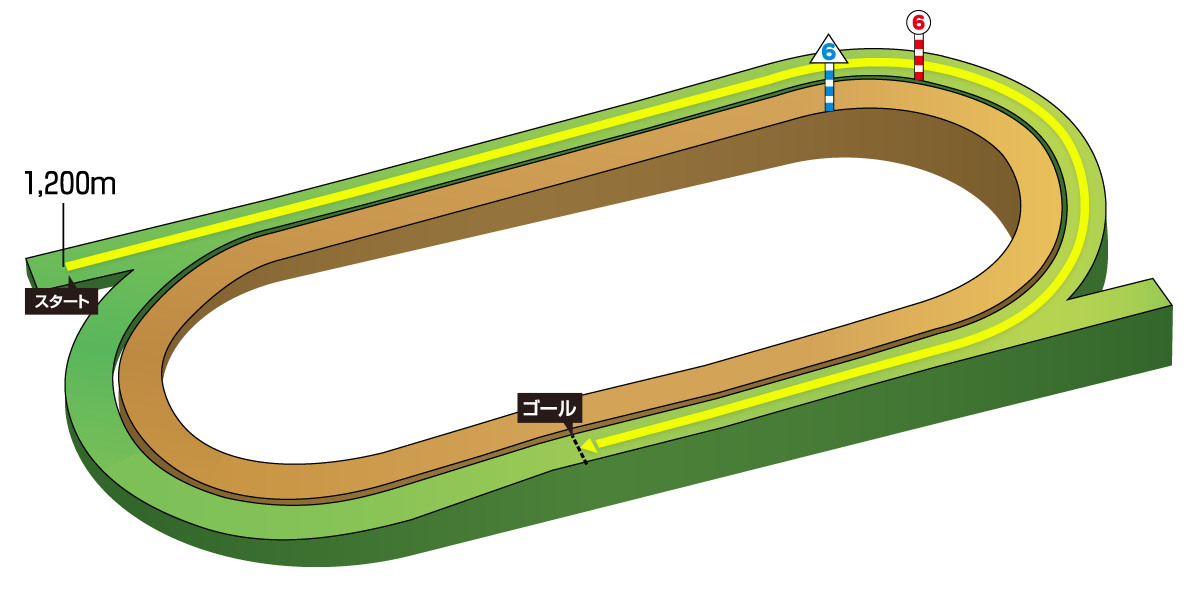2コーナー奥のポケット地点からのスタートで、3コーナーまでの距離は約490メートル。スタートから3コーナーと4コーナーの中間付近までは緩やかながらずっと上り勾配が続く。力を要する洋芝コースということもあって、レース前半の消耗度はラップから受ける印象以上に高くなる。ただ、ゴール前の直線は262.1メートルと短く、4コーナー途中からは緩やかな下り勾配になっているので、前がよほどバテないかぎり後方に控えた馬にチャンスは回ってきづらい。このコースで信頼できるのは、激しい先行争いを耐え抜いて直線でもうひと踏ん張りできるスピードとタフさがある馬だ。純粋なスプリント能力に加えて洋芝への対応力も不可欠になる。