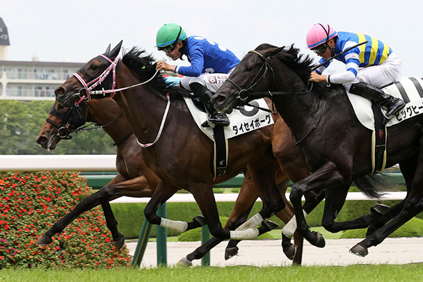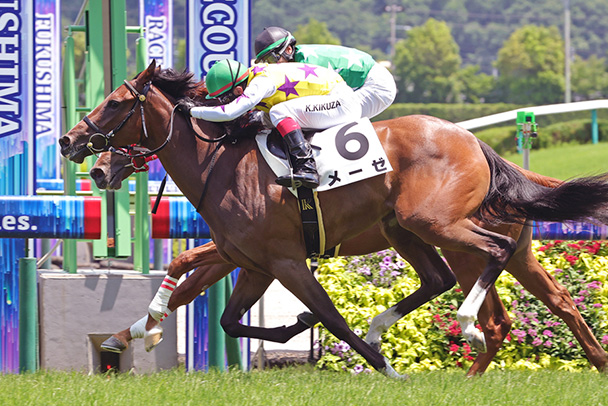 6月28日のメイクデビュー福島(芝1200メートル)は、逃げ馬がハイペースで飛ばす展開。本馬は好位でいくらか追走に忙しそうな面を見せたが、直線では一完歩ごとに差を詰め、ゴール寸前で先頭をきっちりと捕らえて勝利した。騎乗した菊沢一樹騎手は「調教が優秀で、レースでも落ち着いて走れました。道中はフワフワするところもありましたが、最後はしっかり伸びてくれました。この感じなら距離が延びても大丈夫です」とコメントしており、400メートルの距離延長も問題なさそうだ。重賞挑戦に加えて素質馬がそろった今回は、試金石の一戦になる。