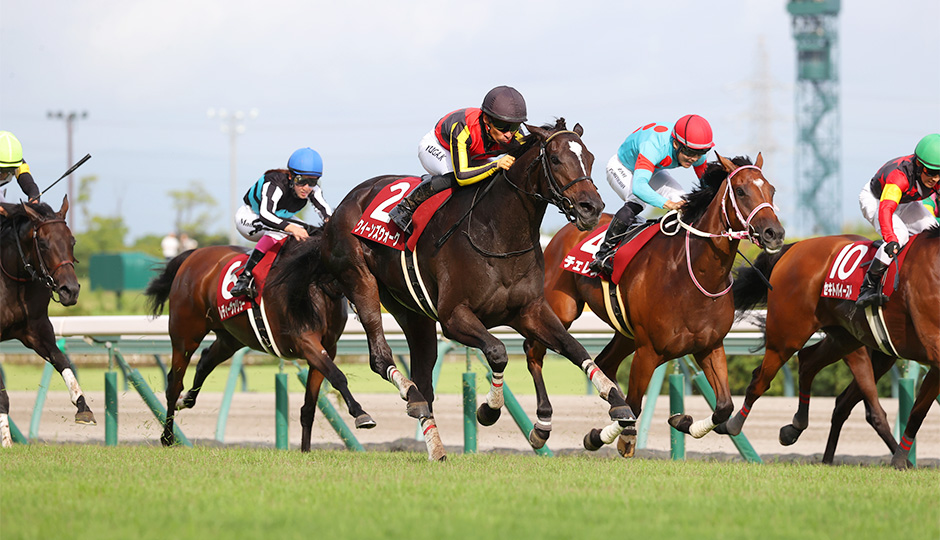 2コーナー近くの引き込み線からスタートして、ほどなく本線に合流する。外回りコースを使用し、最初のコーナー(3コーナー)までの距離は600メートル以上。芝1600メートルを2コーナー方向に200メートル延ばしたレイアウトだ。道中が平均的に速く流れる点ではマイル戦に近いが、この距離では3コーナー手前からペースが緩んで、多少でもラップにメリハリが生じることが多い。ホームストレッチはゴールまで473.6メートル(Aコース使用時)。残り600メートル付近から下りが始まり、4コーナーからペースが上がっていくので、ラスト600メートルは速い脚を使い続けなくてはならない。ゴール直前には高低差1.8メートルの坂が待っている。脚をしっかりためなくては勝ち負けするのが難しく、上手に折り合える能力が重要になる。