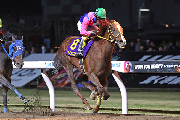 一昨年の帝王賞(JpnⅠ・大井・ダート2000メートル)を制して以降、白星から遠ざかっていたが、その中でも昨年もJBCクラシック(JpnⅠ・佐賀・ダート2000メートル)で2着に好走するなど、ダートの一線級で力を示していた。8歳となった今年は、4月の川崎記念(JpnⅠ・川崎・ダート2100メートル)で久しぶりの白星をゲット。船橋開催の前走・JBCクラシック(JpnⅠ・ダート1800メートル)でも2着に好走しており、いい流れのまま今回に向かえそうだ。管理する岡田稲男調教師は「一回使って体もグッと良くなりました。(8歳で)しんどさもあると思うけど、気持ちでカバーしている。走りから、気持ちとともに躍動感が伝わってきます」と、愛馬の頑張りに目を見張る。