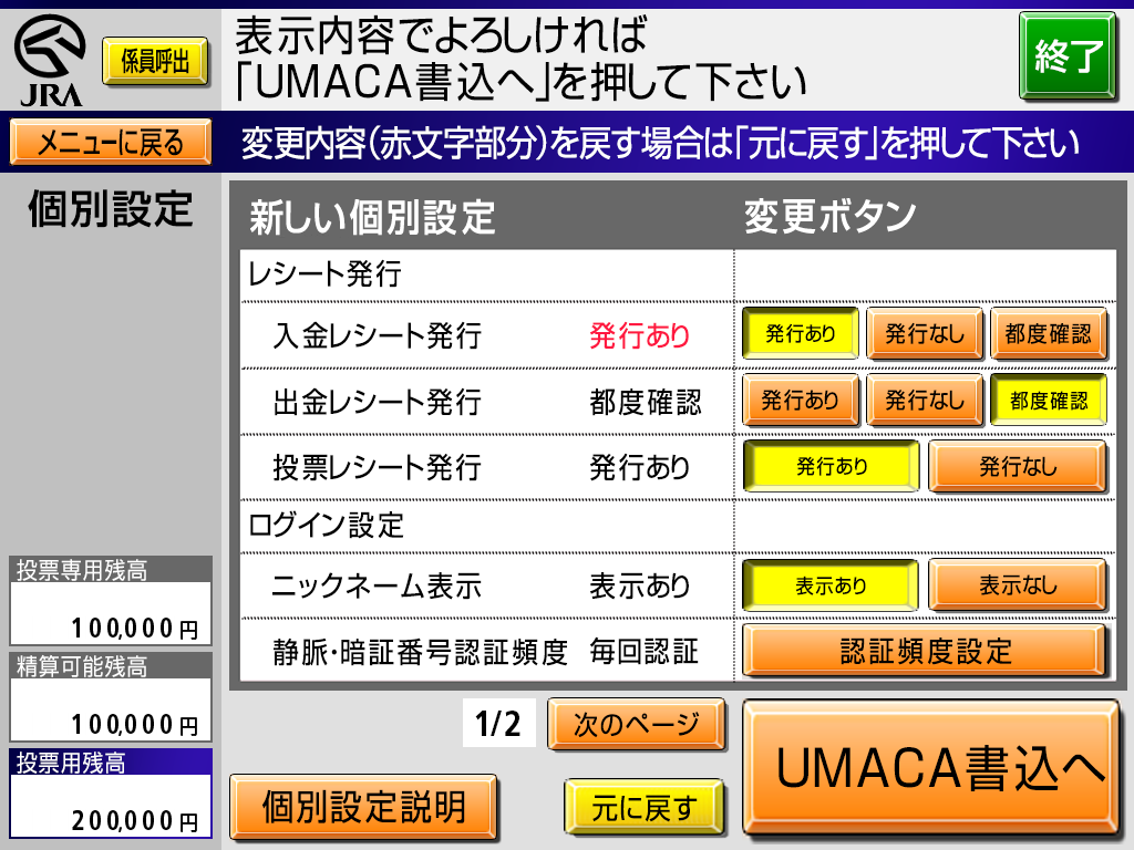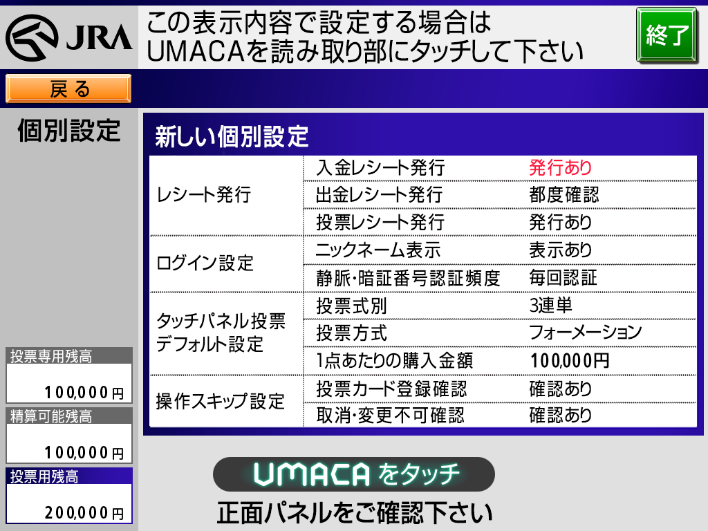 UMACAで購入する際、ログイン時の認証頻度やマークカードの登録・取消・変更不可の確認省略など、お客様のお好みで設定できます。 個別設定をすれば毎回のログインがもっとスムーズにできるほか、購入スピードがアップするなど、いいことたくさん!お気に入りの設定にカスタマイズして、より便利に楽しくUMACAをご利用ください!