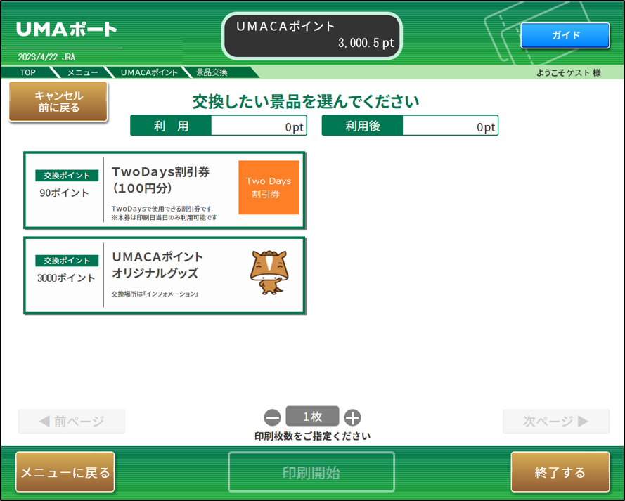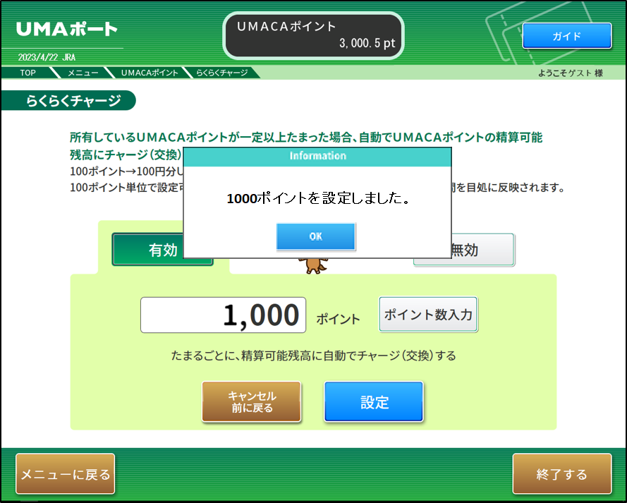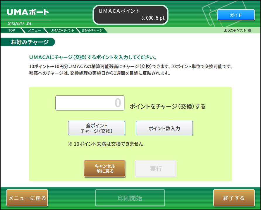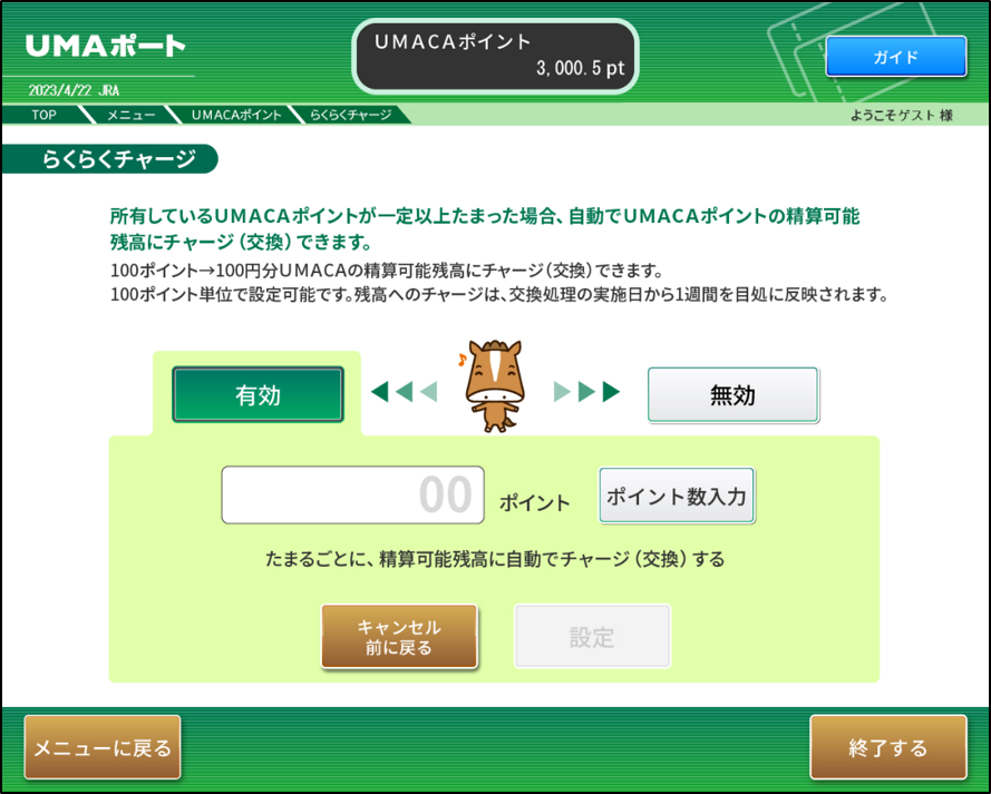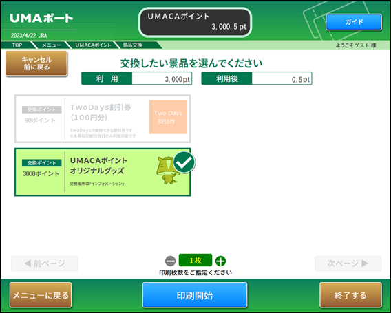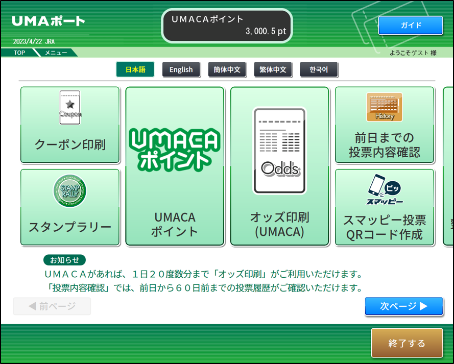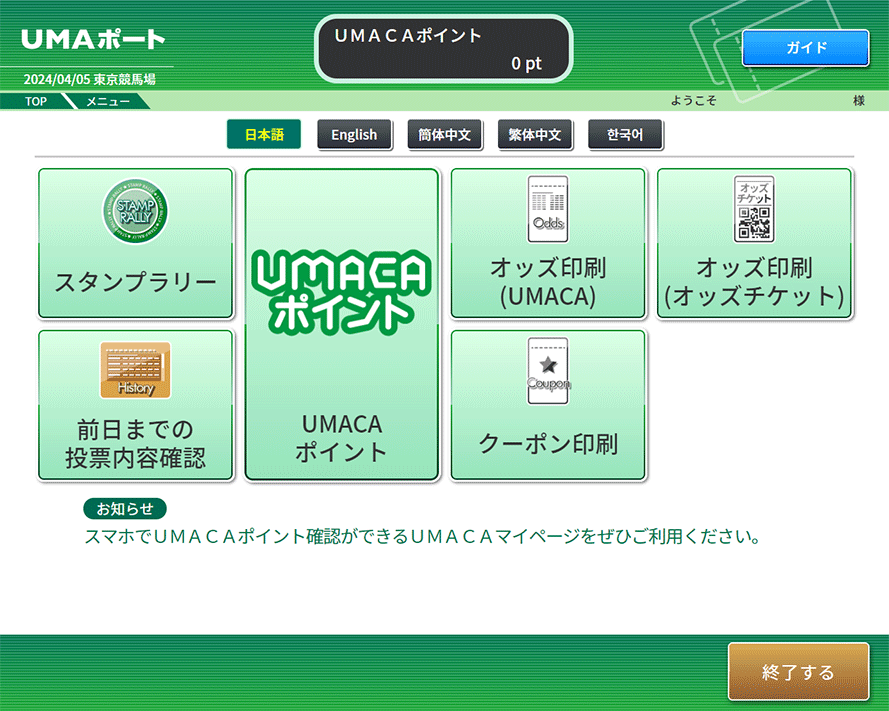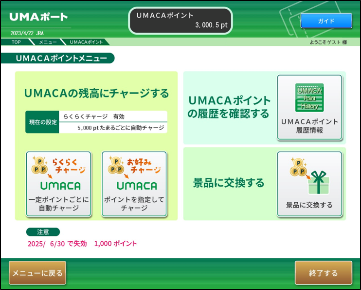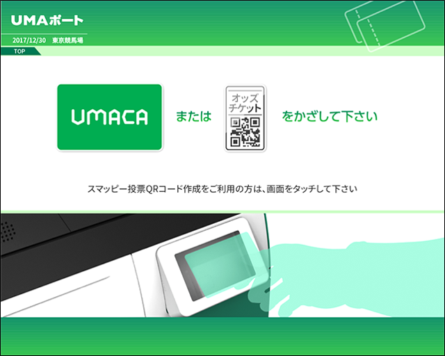 競馬場、ウインズ等に設置されているUMAポートでUMACAチャージまたは景品交換の操作や、ポイント利用状況の照会ができます。