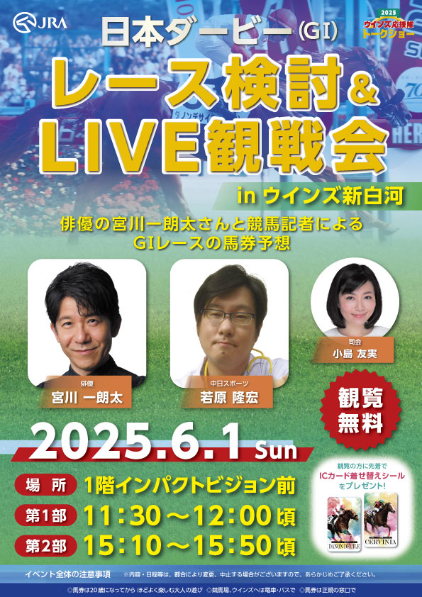 ウインズでは、日頃のご愛顧に感謝を込めて、全国10カ所で「2025ウインズ応援隊 トークショー」を開催いたします。 6月1日(日曜)の日本ダービー(GⅠ)当日は、俳優の宮川一朗太さんをお迎えしてウインズ新白河でトークショーを開催します。 皆様のご来場を心よりお待ちいたしております。