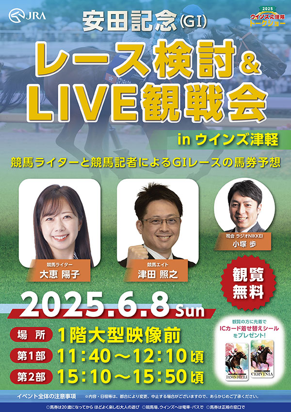 6月8日(日曜)の安田記念(GⅠ)当日は、競馬エイトの津田照之さんと競馬ライターの大恵陽子さんをお迎えしてウインズ津軽でトークショーを開催します。