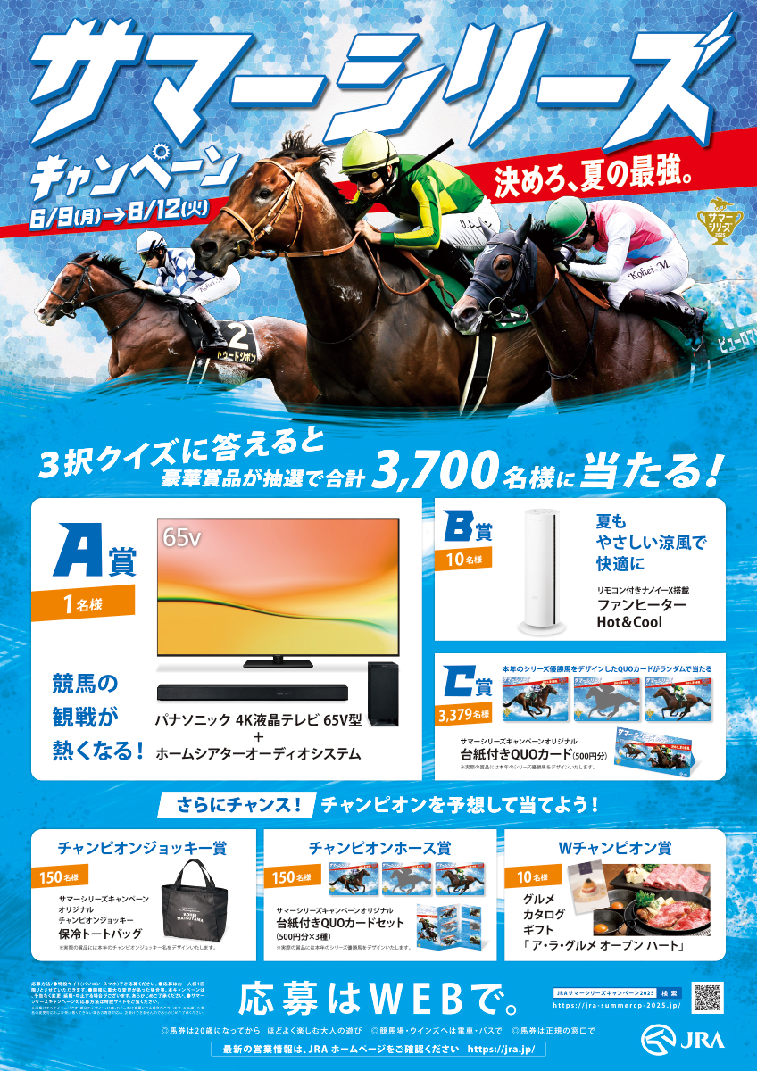 簡単なクイズに答えてご応募いただくと抽選で合計3,700名様に豪華賞品が当たります。競馬ビギナーの方も奮ってご応募ください。また、シリーズ結果を予想すると、豪華賞品獲得のチャンスが広がります!