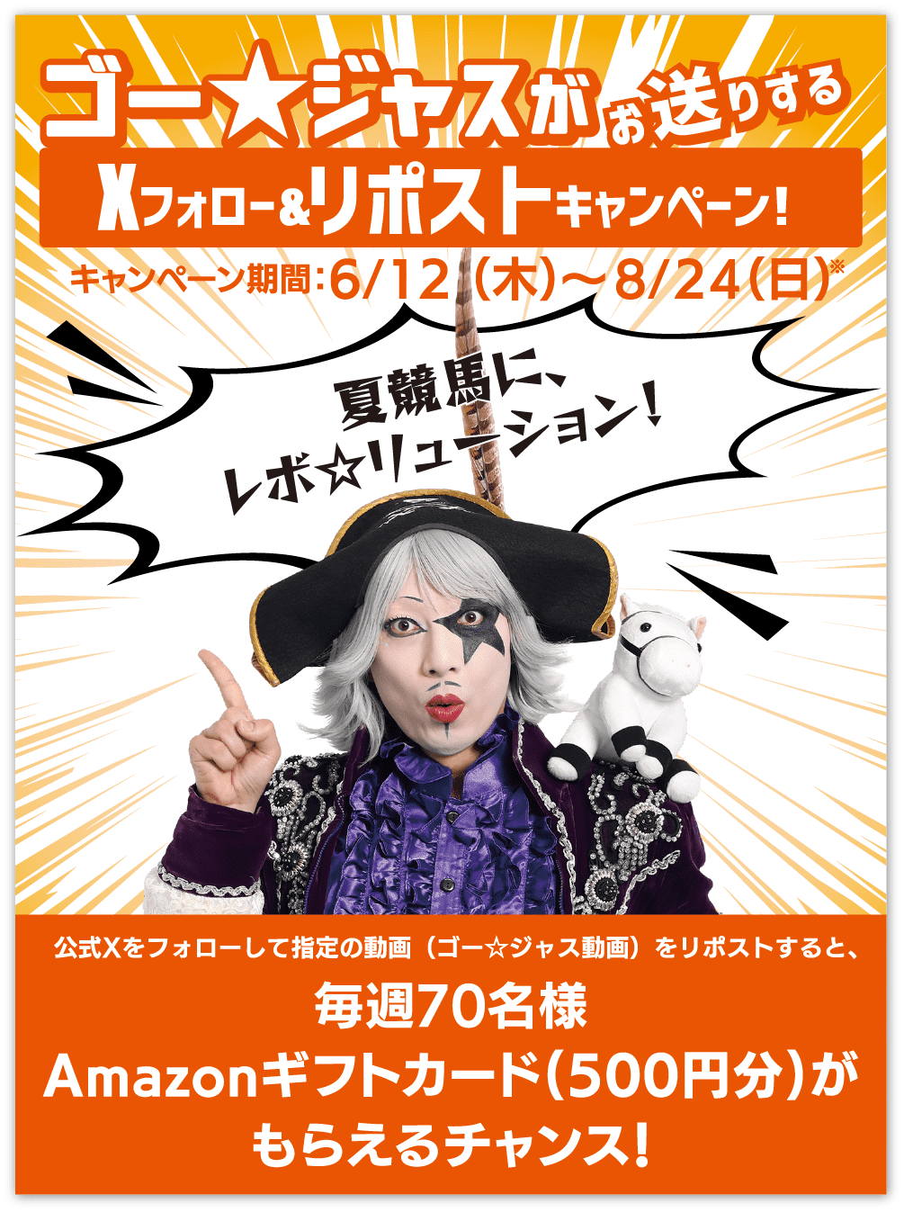 キャンペーンは、6月12日(木曜)12時00分より、JRAサマーシリーズキャンペーン公式X(@JRAsummercp)をフォローのうえ、毎週木曜にポストされるゴー☆ジャス動画をリポストいただくと参加できます。