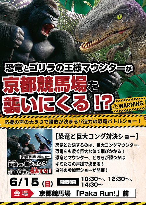 恐竜と巨大ゴリラが京都競馬場で大暴れ!?大迫力のバトルショーを宝塚記念(GⅠ)当日のパークウインズ京都競馬場にて開催いたします!