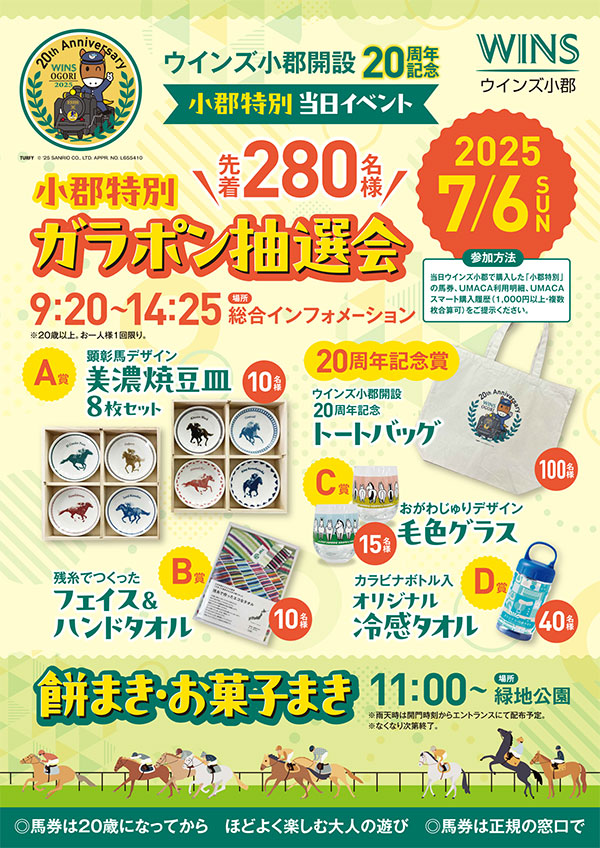 ウインズ小郡は、おかげさまで今年開設20周年を迎えました。 7月6日(日曜)【小郡特別当日】、特別デザインのトートバッグやJRAオリジナルグッズが当たる抽選会を行います。さらに山口県では、お祭りやイベントで定番となっている餅まきも行います。 この機会にぜひウインズ小郡にお越しください。