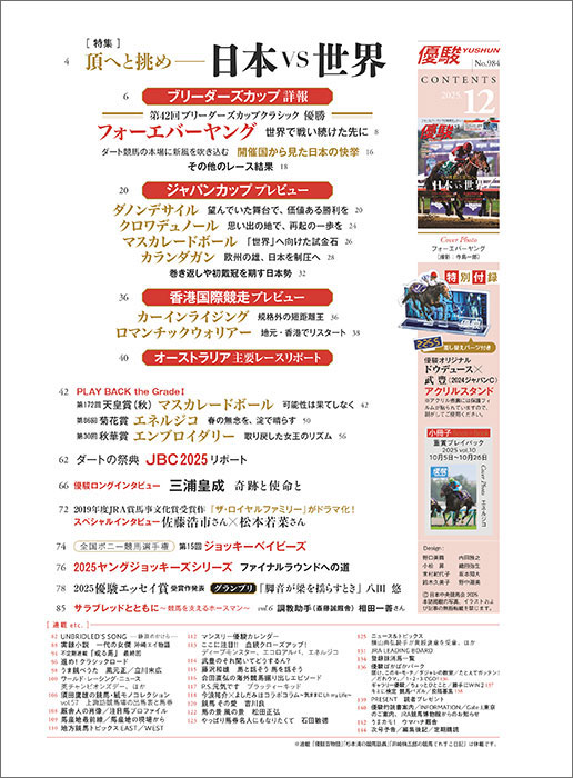 天皇賞(秋)、菊花賞、秋華賞に加え、ダートの祭典「JBC」の詳報や、スプリンターズステークスで初GⅠ勝利をあげた三浦皇成騎手のインタビューも収録。第15回ジョッキーベイビーズの結果や2025ヤングジョッキーズシリーズ ファイナルラウンドの出場騎手紹介、2025優駿エッセイ賞受賞作発表とグランプリ作品の掲載など、充実の内容です。