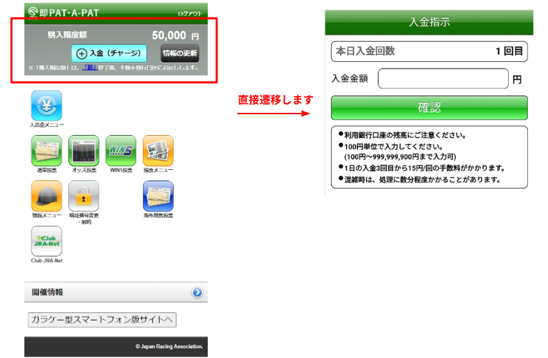 即PATのトップメニュー画面に「入金(チャージ)」ボタンが追加され、ボタンを押すと入金指示画面に遷移します。