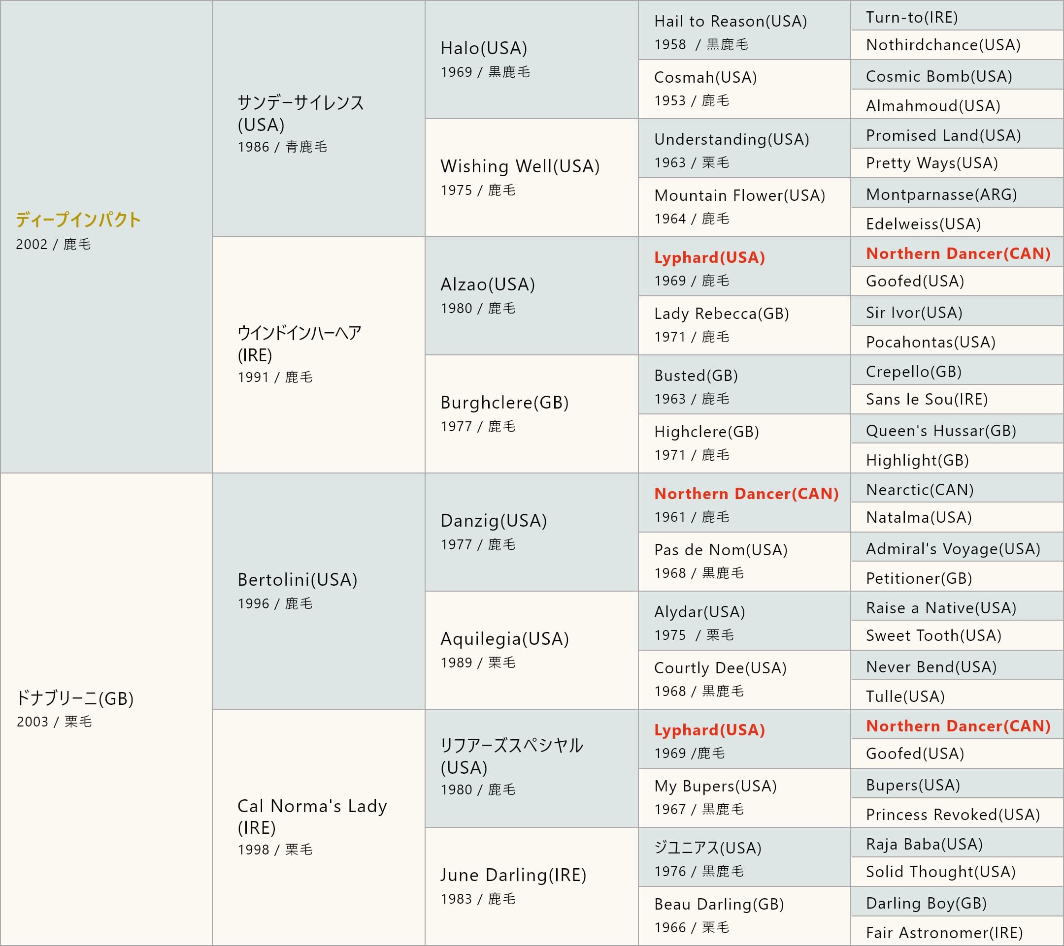 - ディープインパクトは2002年3月25日に北海道早来町(現安平町)のノーザンファームで誕生した。父サンデーサイレンス、母ウインドインハーヘアという血統だ。ウインドインハーヘアは、英オークスで2着になるほどの実力の持ち主だった。彼女の驚くべきエピソードは4歳8月にドイツでG1初制覇を果たしているが、この時に妊娠していたことだ。身ごもった状態でレースに勝ってしまうあたり生命力の強さを感じる。2024年9月現在、33歳になった今もウインドインハーヘアはノーザンホースパークで余生を送っている。