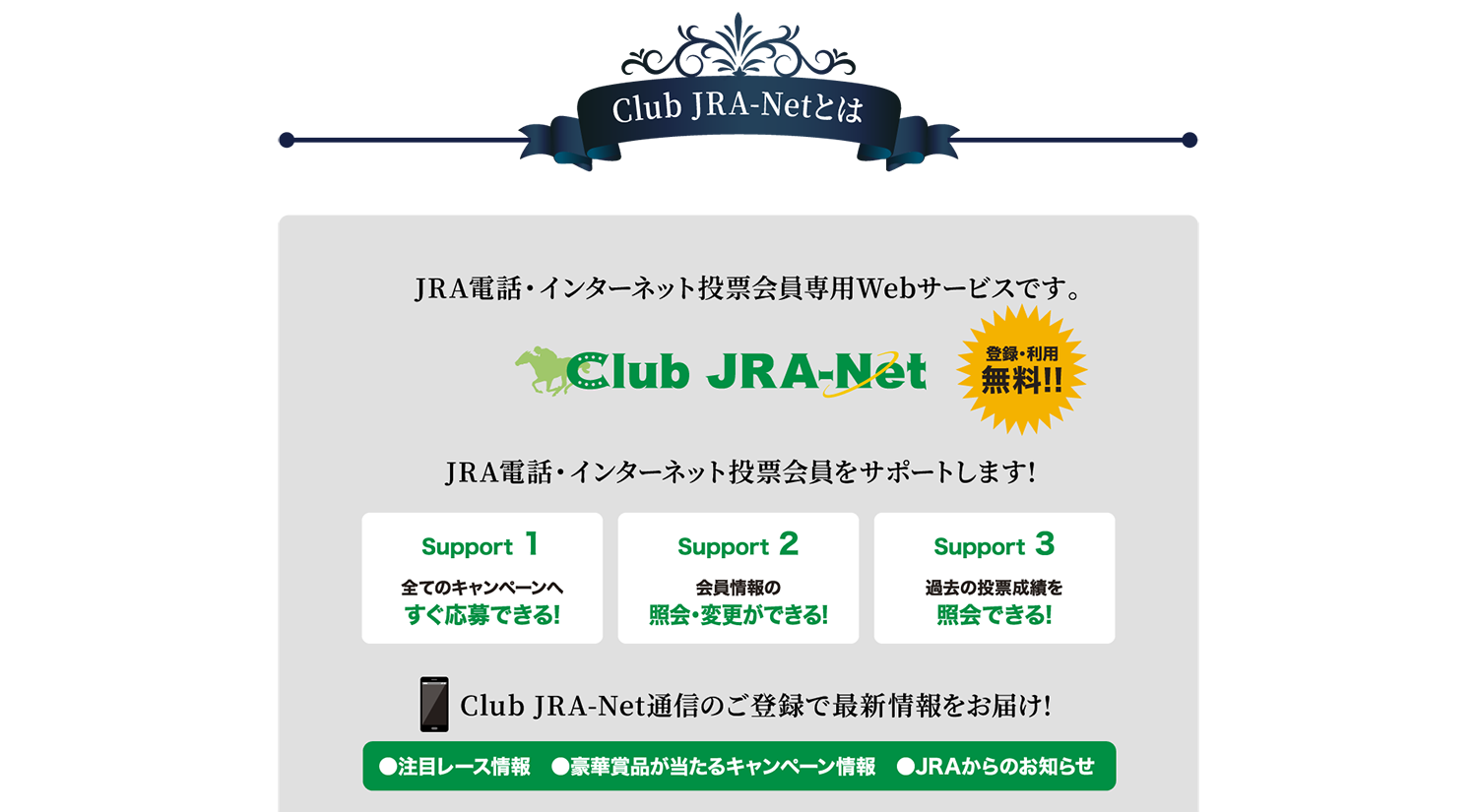 Club JRA-Netは登録料・年会費が無料のJRA電話・インターネット投票会員用Webサービスです。JRA電話・インターネット投票会員であれば、ご登録後どなたでもご利用いただけます。Club JRA-Netを初めてご利用いただく際は、Club JRA-Net「新規登録」よりご登録を行ってください。