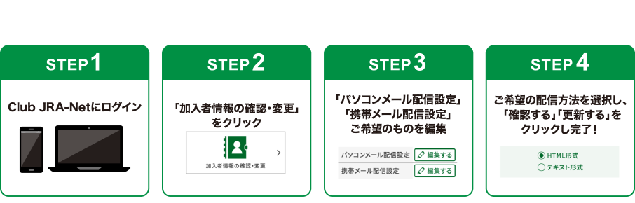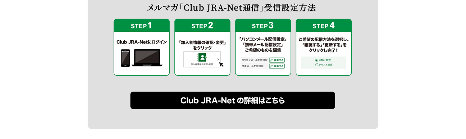 Club JRA-Netにログイン後、「加入者情報の確認・変更」メニューよりメール配信設定の変更を行ってください。