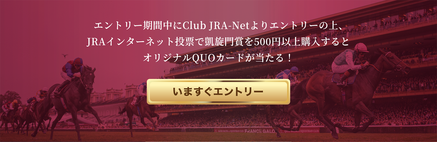 JRAインターネット投票会員(即PAT・A-PAT)限定のプレゼントキャンペーンです。Club JRA-Netサイトからエントリーし、JRAインターネット投票で10月5日(日)にフランスで開催される「凱旋門賞」の馬券を500円以上ご購入いただくと、抽選で10,000名様に台紙付きオリジナルQUOカード(500円分)をプレゼントいたします。