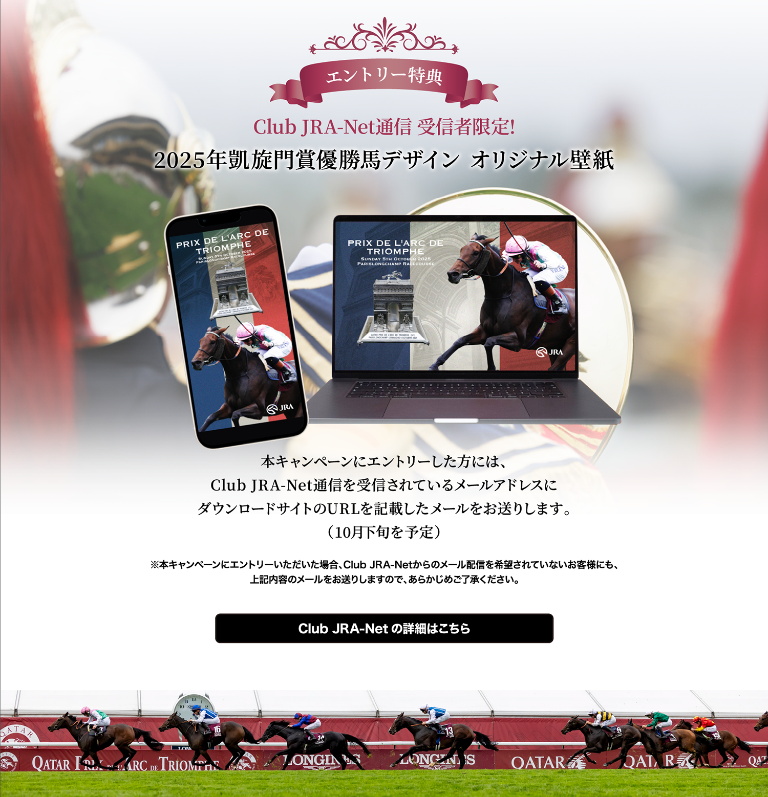 本キャンペーンは、Club JRA-Netサイトでエントリーいただき、JRAインターネット投票で凱旋門賞の馬券を500円以上ご購入いただきますと、抽選で賞品が当たるキャンペーンです。エントリー期間は、2025年10月5日(日)23:59までです。